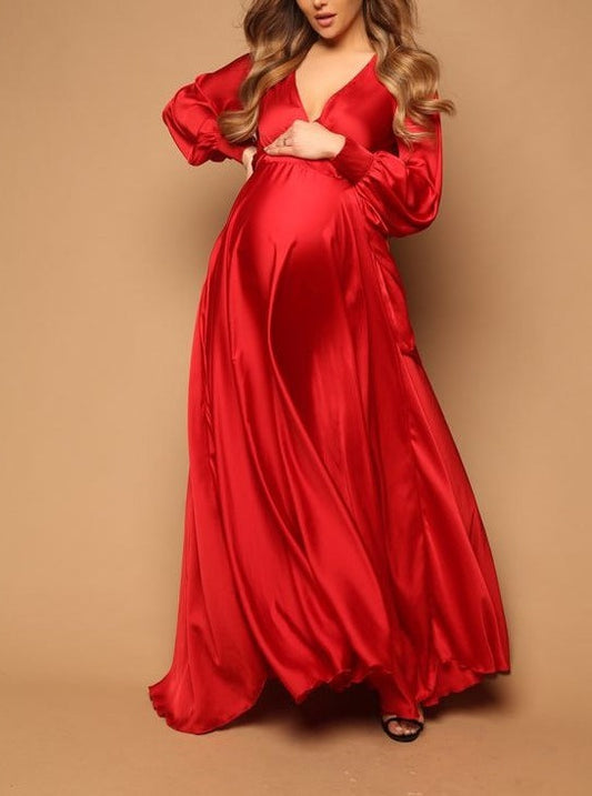 Baby Bump Red Long Satin Maxi Gown Dress for Photoshoots