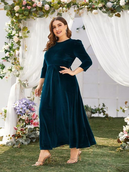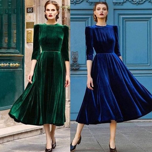 Blue Midi Puff Sleeves Velvet Dress for any Special Occasions