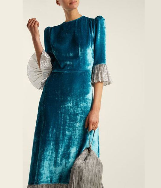 Blue Long Velvet Ruffle Hem Maxi Dress with Half Sleeves