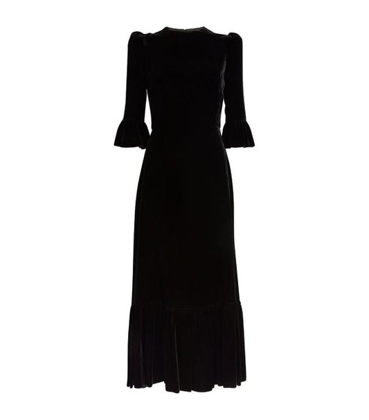 Black Long Velvet Dress with Puff Sleeves and Ruffle Hem