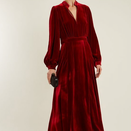 Red Velvet Maxi Dress with Ruffle Hem and Puff Sleeves