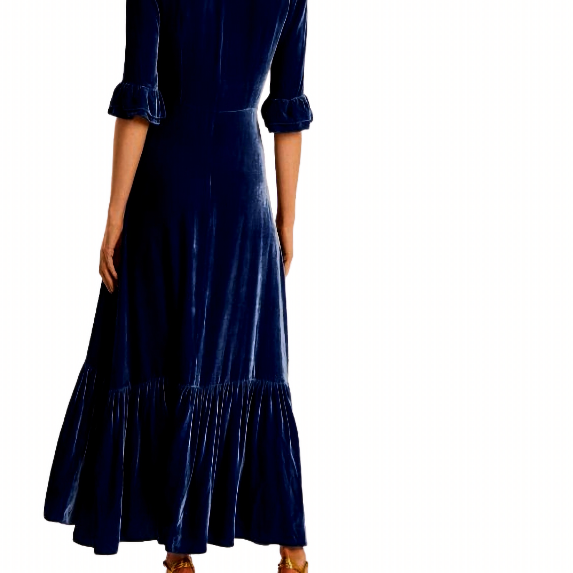 Blue Long Velvet Ruffle Hem Maxi Dress with Half Sleeves