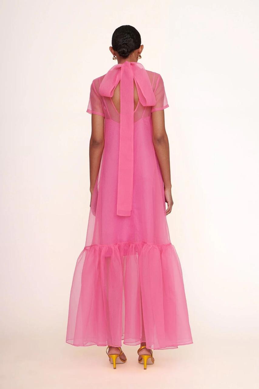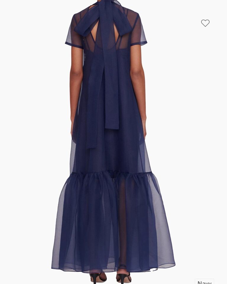 a high neck organza gown with scoop back and functional neck tie. ruffle hem and a midi slip. Handcrafted by PRISTINE INDIA.