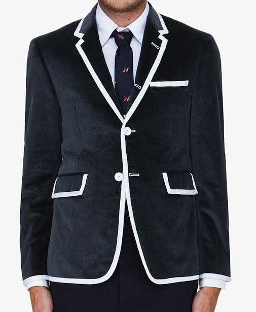 A black velvet jacket with white trim, Handcrafted by Pristine India