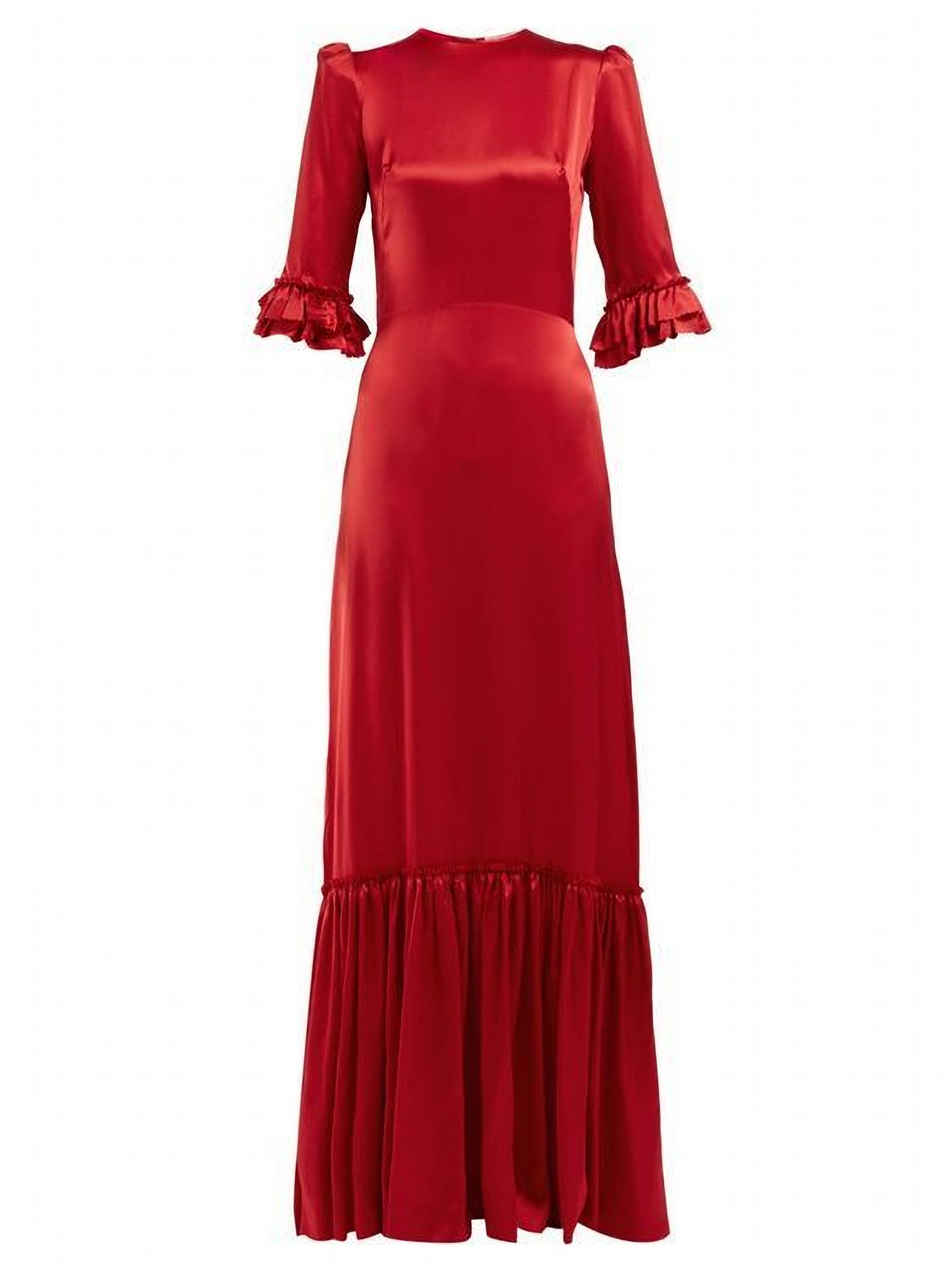 a round neck satin gown with truffle hem and a midi slip. Handcrafted by PRISTINE INDIA.