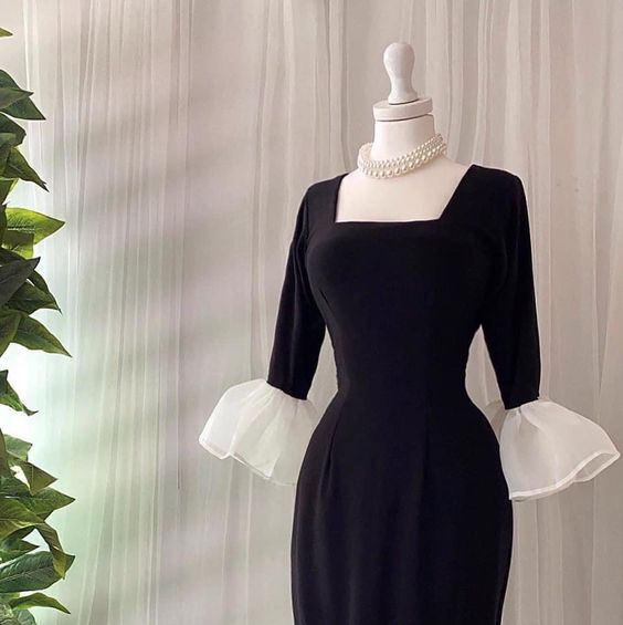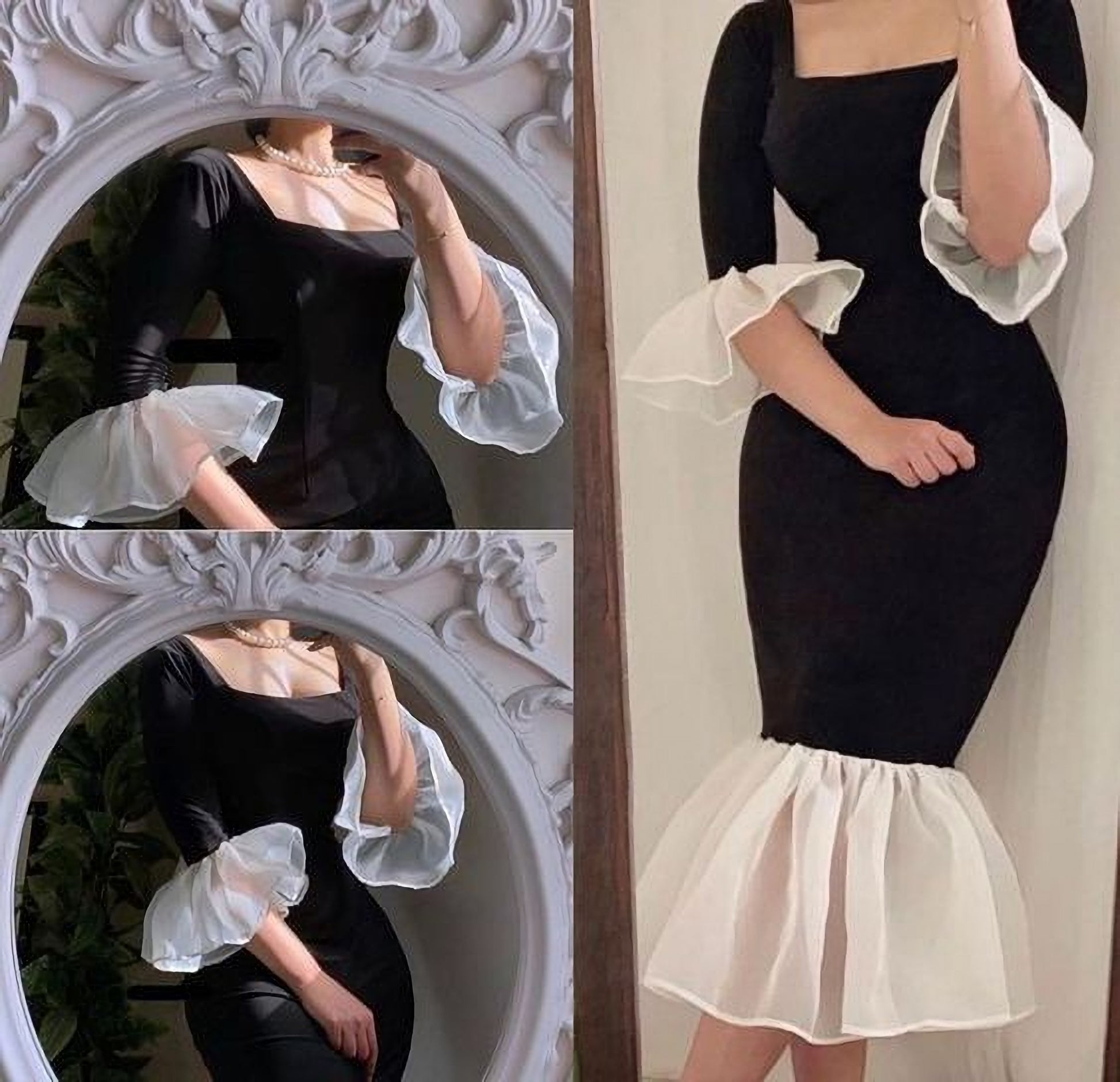 A black velvet square neck bodycon dress with white ruffle Handcrafted by PRISTINE INDIA.