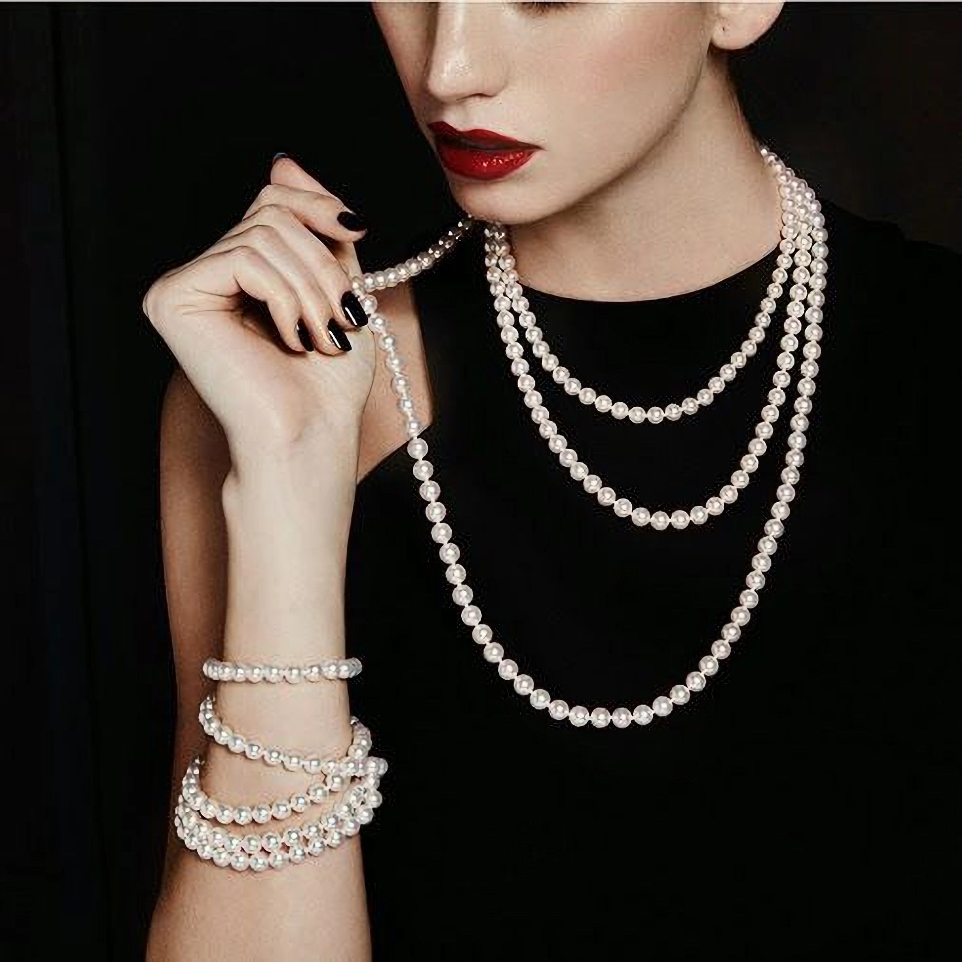 It is very classic and tradition style, three strand necklace of white glass pearls.