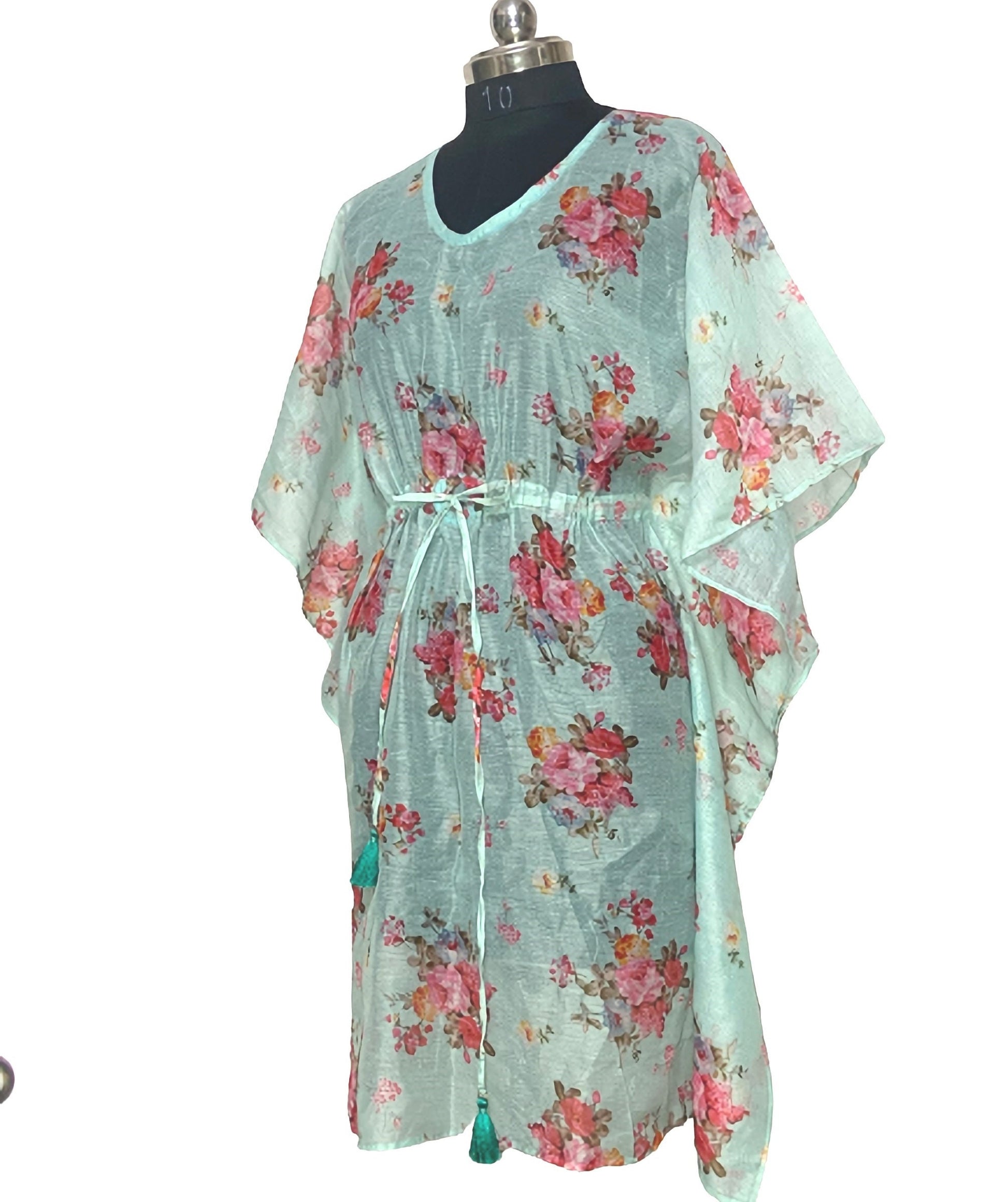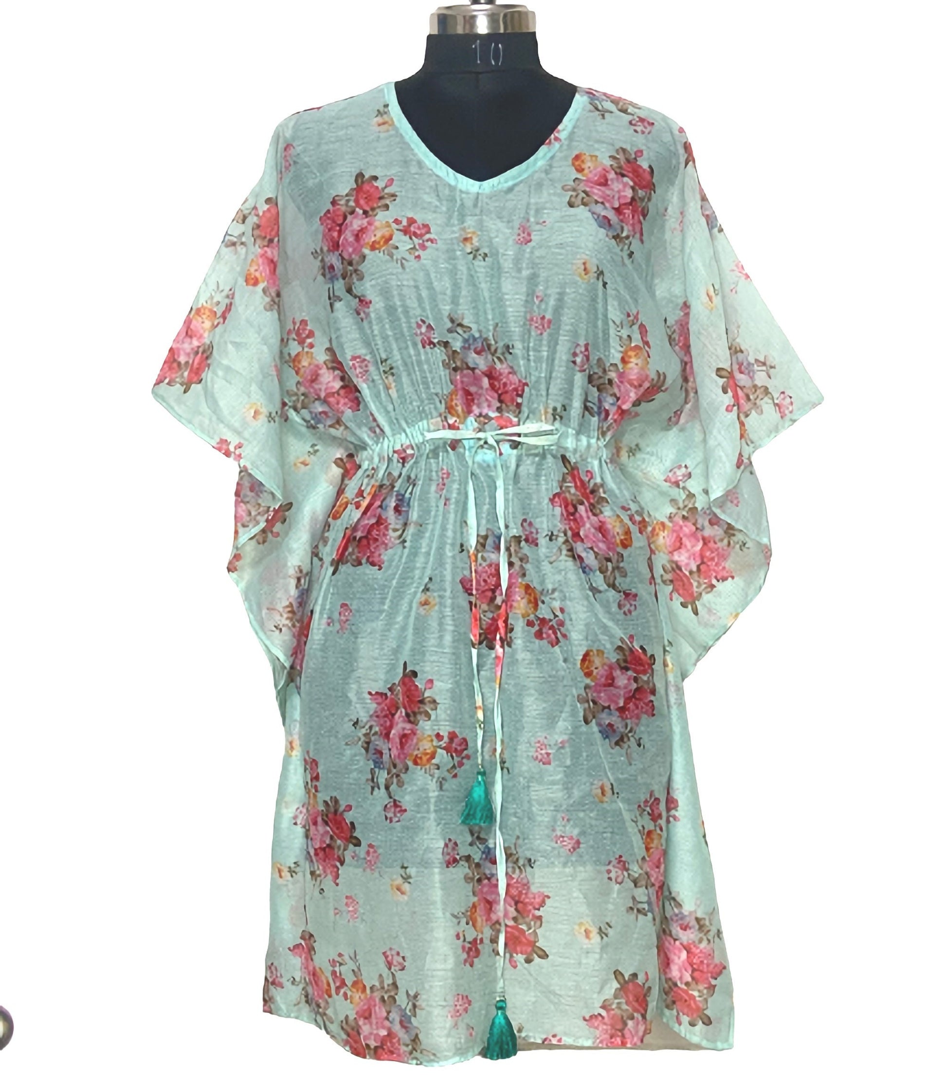 A V-neck short beach cover up dress with waist tie Handcrafted by PRISTINE INDIA